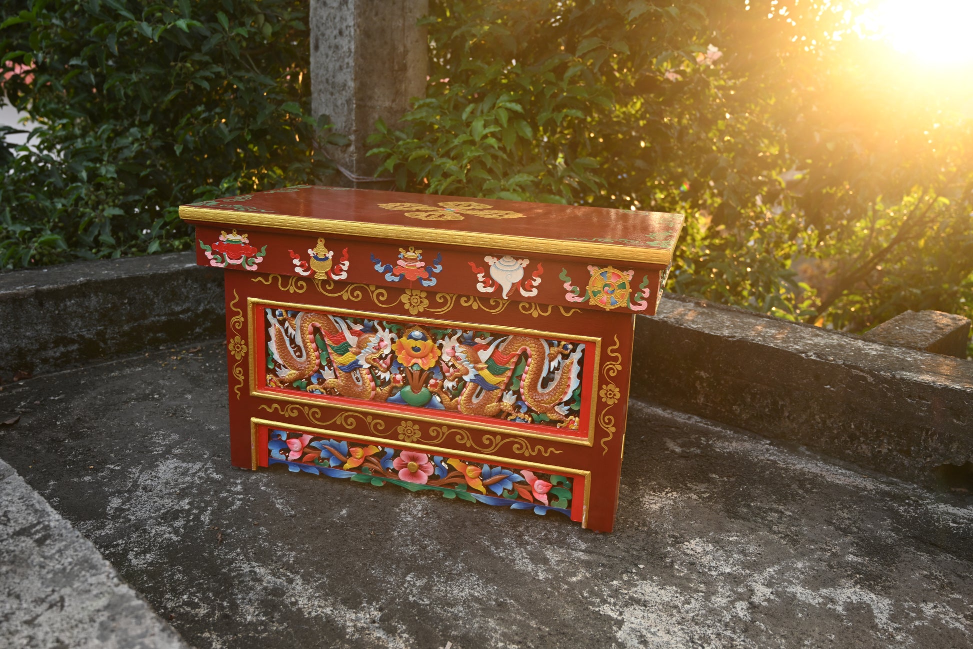 A Sikkimese choktse is a beautifully crafted, foldable wooden table that originated in the Gangtok region of Sikkim, India. Rooted in Tibetan traditions, these tables are made from local woods such as kath or tsingh. The process involves cutting the wood into pieces, carving intricate motifs on them, and affixing these decorated panels onto the table structure. The designs are first transferred onto the wood using paper stencils, ensuring precise, delicate detail.